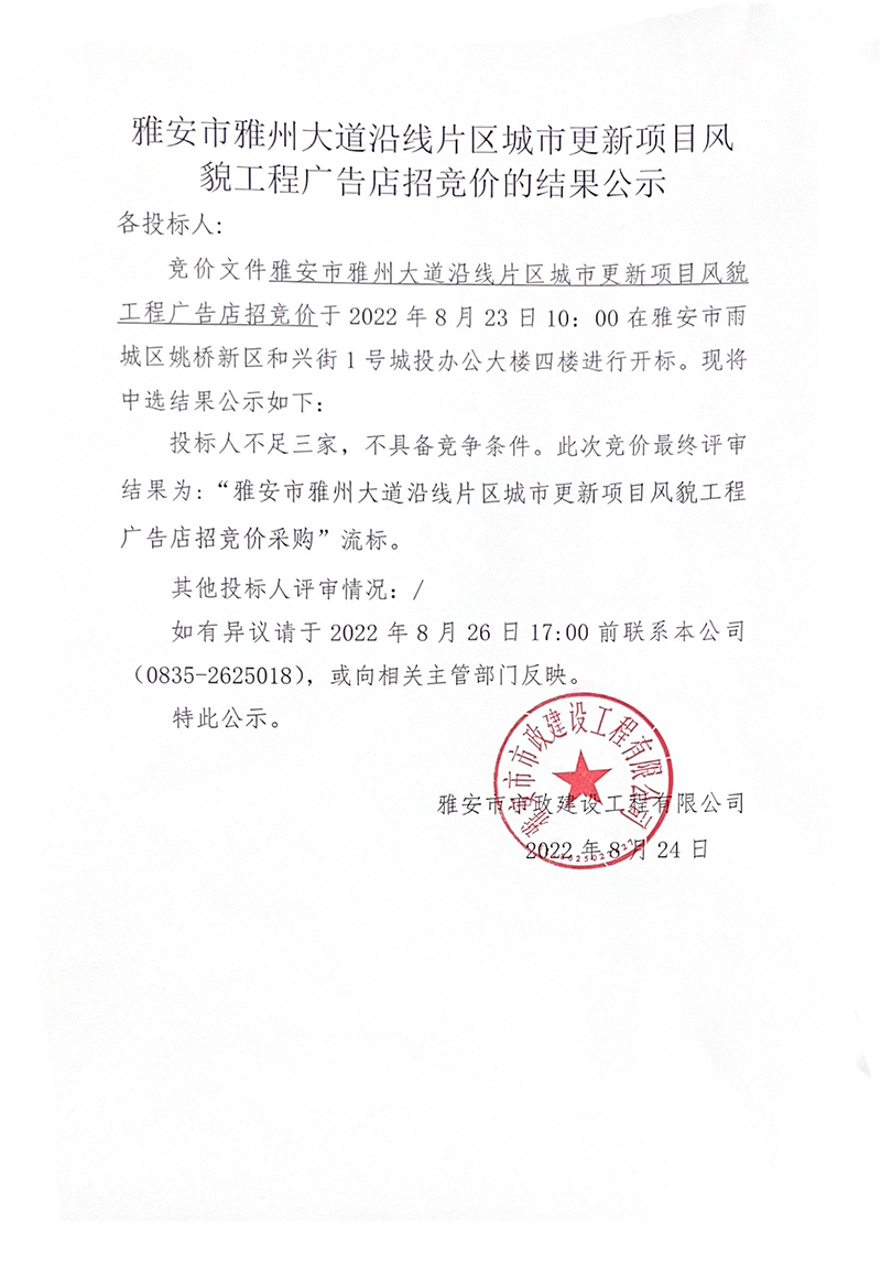 雅安市雅州大道沿線片區(qū)城市更新項(xiàng)目風(fēng)貌工程廣告店招競價(jià)的結(jié)果公示