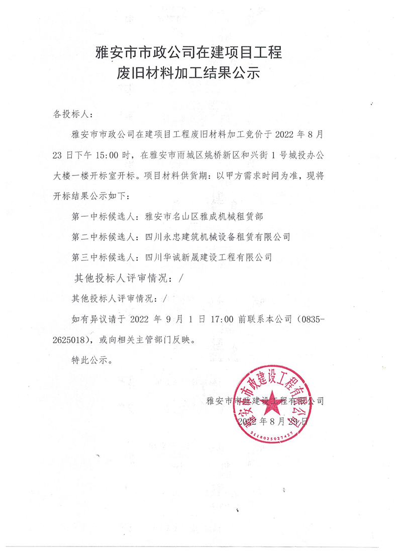 雅安市市政公司在建項(xiàng)目工程廢料加工結(jié)果公示