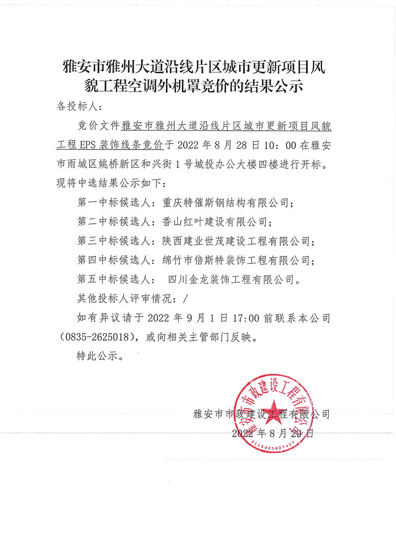 雅安市雅州大道沿線片區(qū)城市更新項(xiàng)目風(fēng)貌工程空調(diào)外機(jī)罩競價的結(jié)果公示
