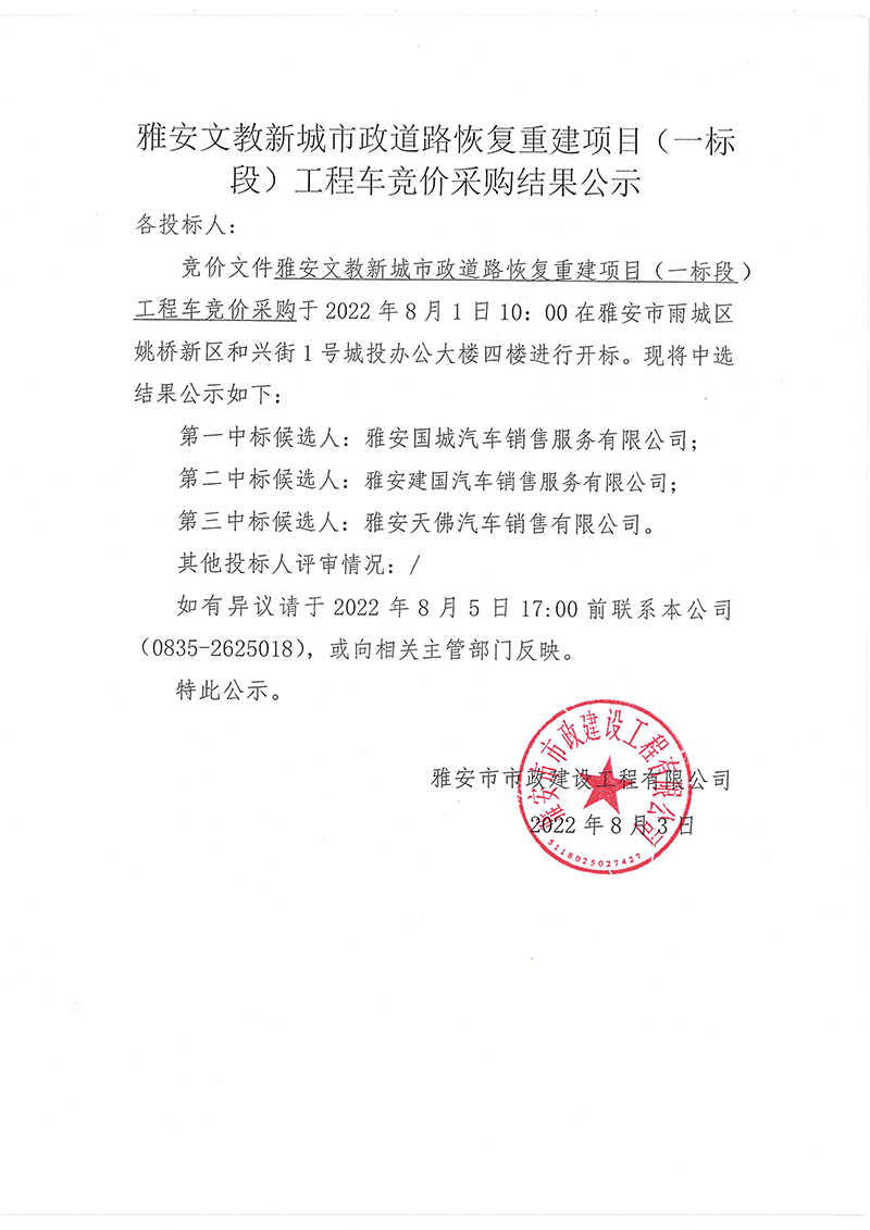 雅安文教新城市政道路恢復(fù)重建項(xiàng)目(一標(biāo)段)工程車競(jìng)價(jià)采購結(jié)果公示