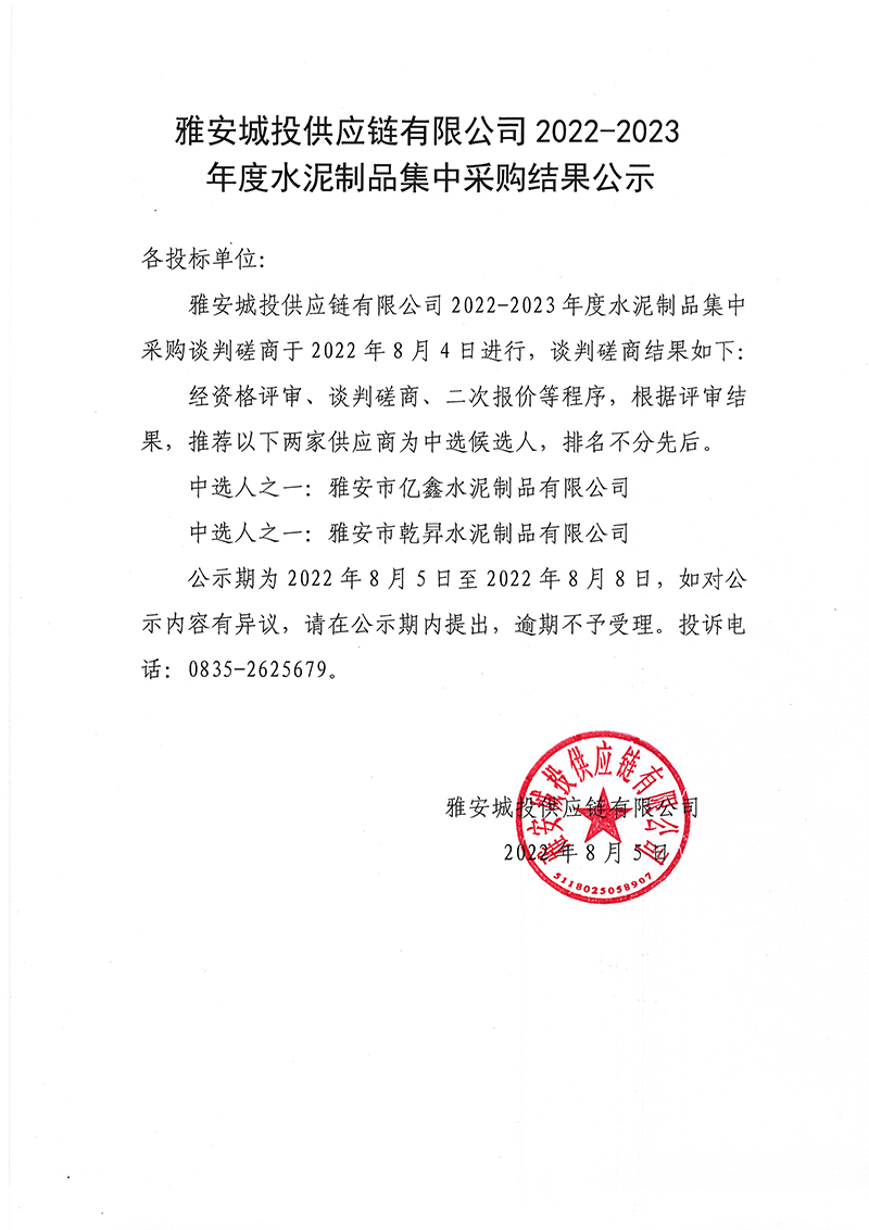 雅安城投供應鏈有限公司2022-2023年度水泥制品集中采購結(jié)果公示