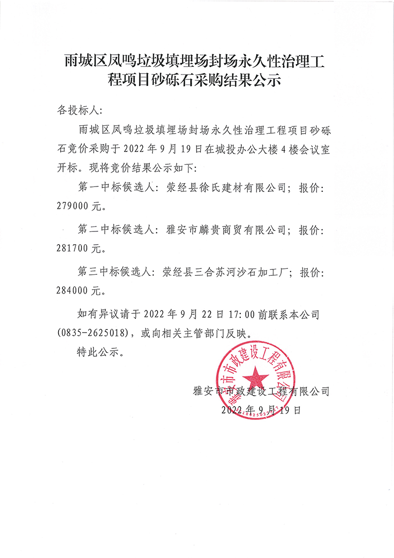 雨城區(qū)鳳鳴垃圾填埋場(chǎng)永久性封場(chǎng)治理工程項(xiàng)目砂礫石采購(gòu)結(jié)果公示