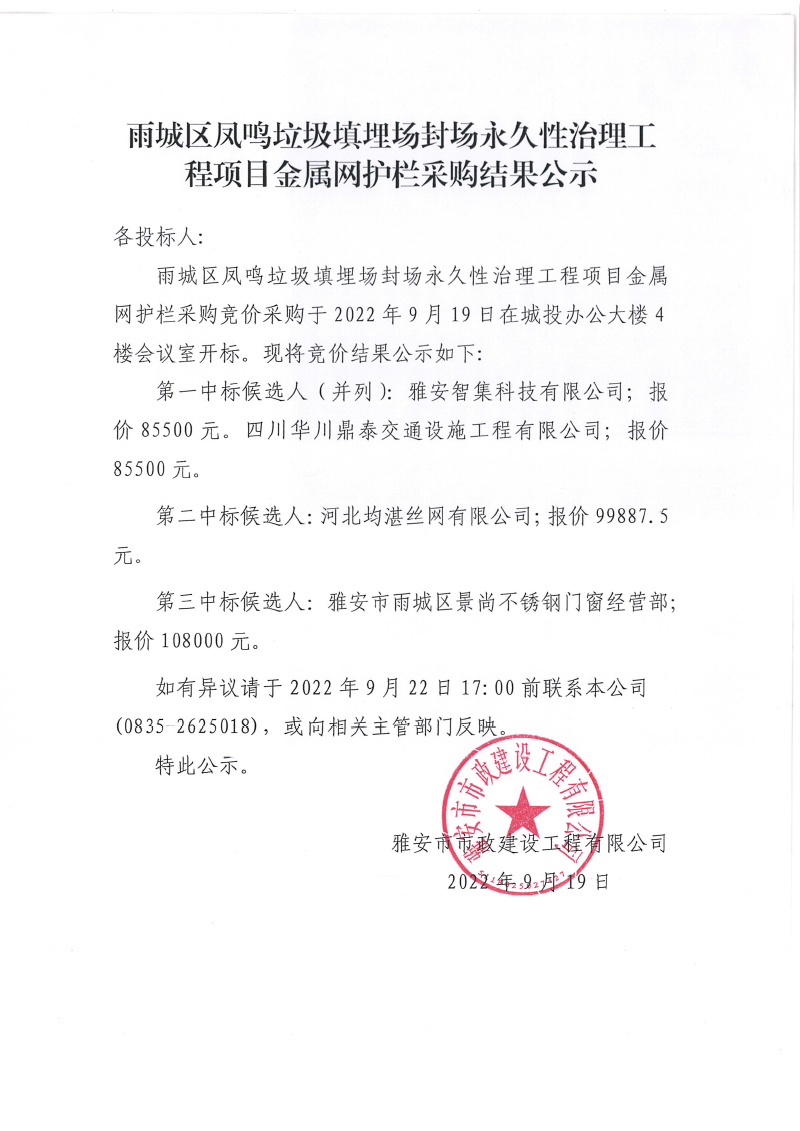 雨城區(qū)鳳鳴垃圾填埋場(chǎng)永久性封場(chǎng)治理工程項(xiàng)目金屬網(wǎng)護(hù)欄采購(gòu)結(jié)果公示