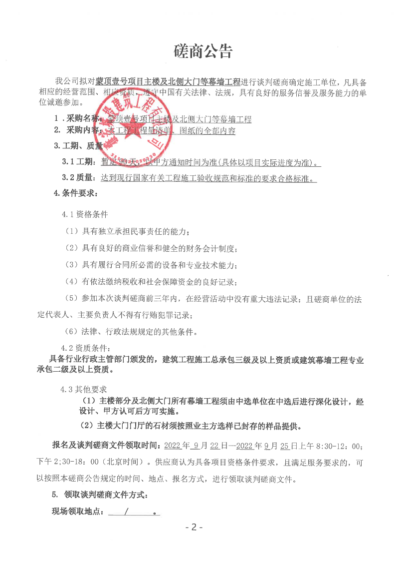 蒙頂壹號項目主樓及北側大門等幕墻工程談判磋商公告