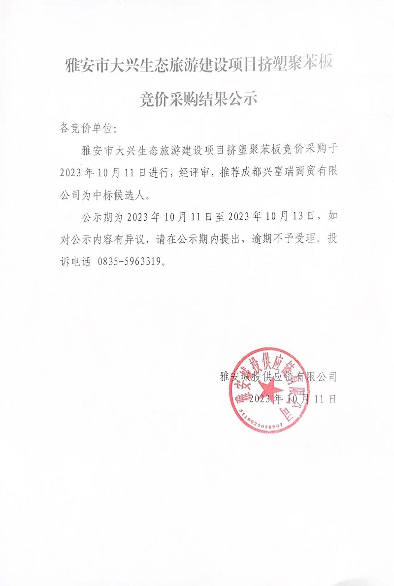 雅安市大興生態(tài)旅游建設(shè)項(xiàng)目擠塑聚苯板競(jìng)價(jià)采購(gòu)結(jié)果公示