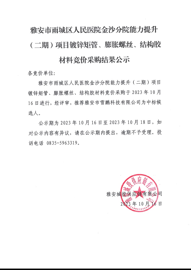雅安市雨城區(qū)人民醫(yī)院金沙分院能力提升(二期)項(xiàng)目鍍鋅矩管、膨脹螺絲、結(jié)構(gòu)膠材料競(jìng)價(jià)采購結(jié)果公示