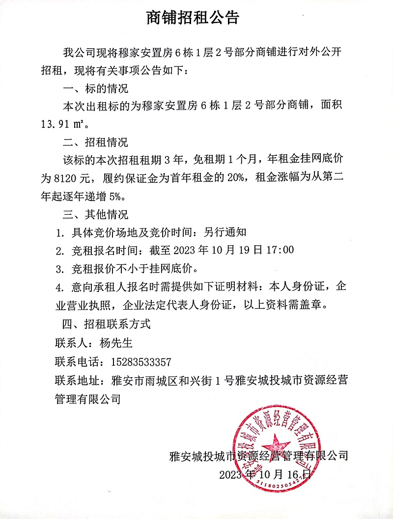 穆家安置房6棟1層2號(hào)部分商鋪招租公告