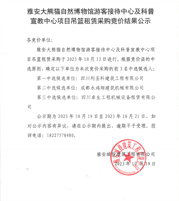 雅安大熊貓自然博物館游客接待中心及科普宣教中心項(xiàng)目吊籃租賃采購競(jìng)價(jià)結(jié)果公示