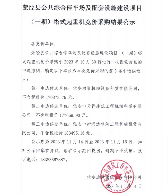 滎經(jīng)縣公共綜合停車場及配套設施建設項目(一期)塔式起重機競價采購結果公示