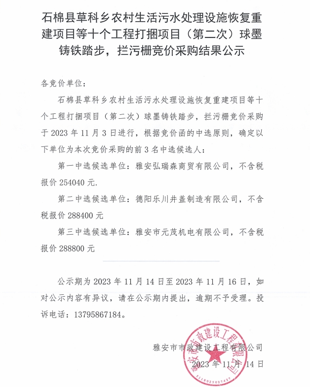 石棉縣草科鄉(xiāng)農(nóng)村生活污水處理設(shè)施恢復(fù)重建項(xiàng)目等十個工程打捆項(xiàng)目(第二次)球墨鑄鐵踏步,攔污柵競價采購結(jié)果公示