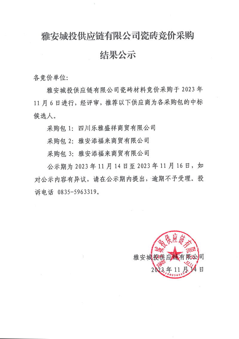 雅安城投供應鏈有限公司瓷磚競價采購結(jié)果公示