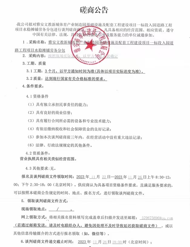 雅安文教新城體育產(chǎn)業(yè)制造園基礎(chǔ)設(shè)施及配套工程建設(shè)項目一標(biāo)段入園道路工程項目水穩(wěn)攤鋪勞務(wù)分包磋商公告