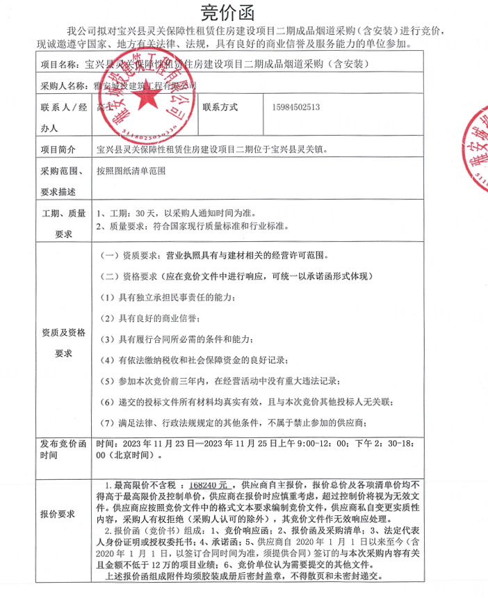 寶興縣靈關(guān)保障性租賃住房建設(shè)項(xiàng)目二期成品煙道采購(gòu)(含安裝)競(jìng)價(jià)公告