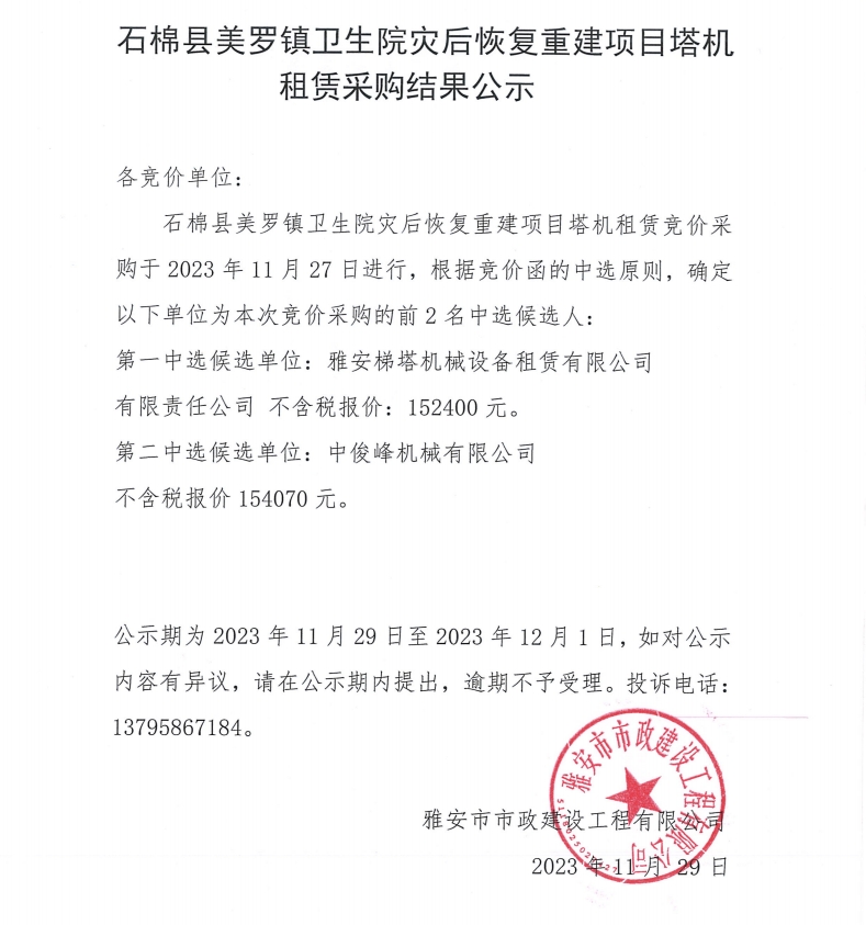 石棉縣美羅鎮(zhèn)衛(wèi)生院災(zāi)后恢復(fù)重建項(xiàng)目塔機(jī)租賃采購(gòu)結(jié)果公示