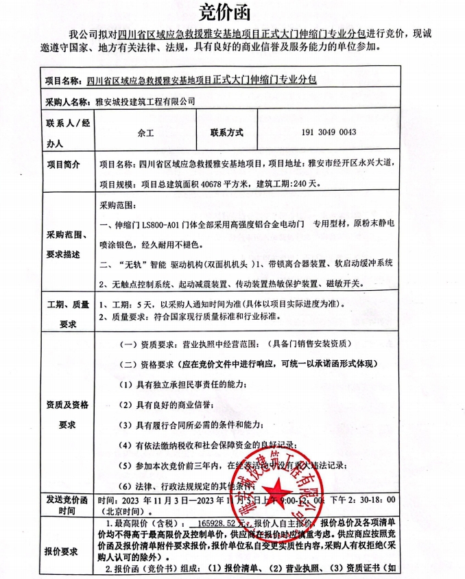 四川省區(qū)域應(yīng)急救援雅安基地項(xiàng)目正式大門伸縮門專業(yè)分包競價(jià)公告
