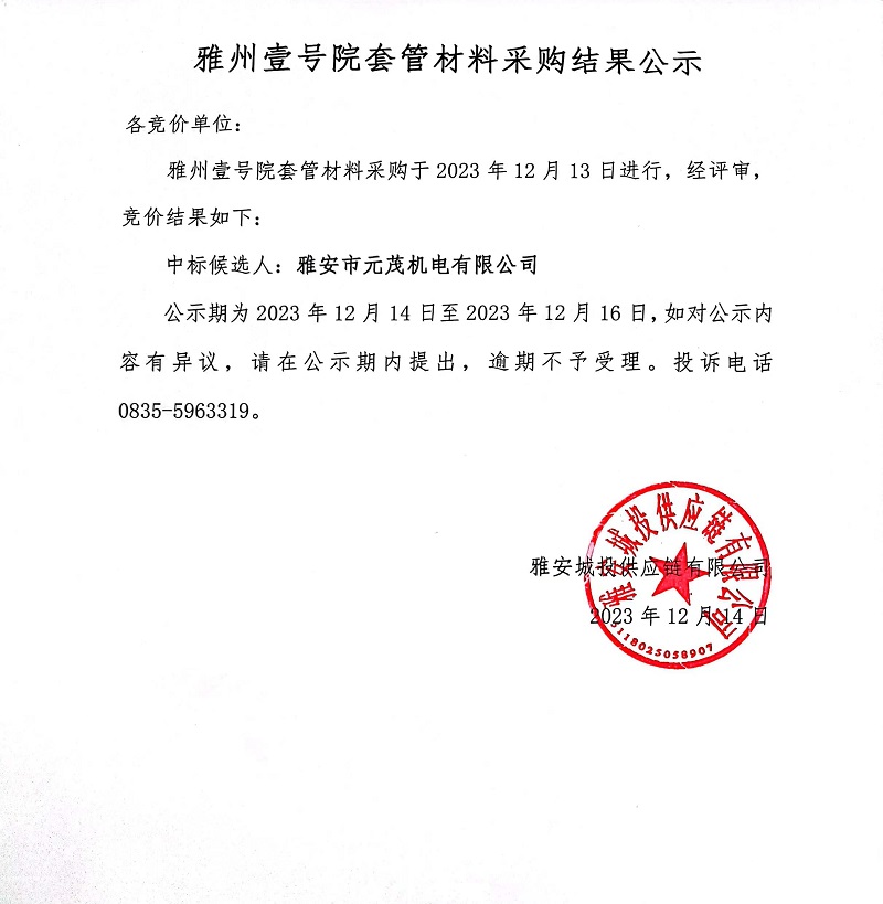 雅州壹號(hào)院套管材料采購(gòu)結(jié)果公示