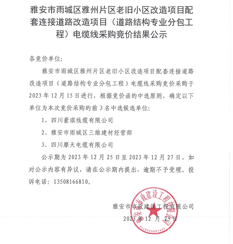 雅安市雨城區(qū)雅州片區(qū)老舊小區(qū)改造項目配套連接道路改造項目(道路結構專業(yè)分包工程)電纜線采購競價結果公示