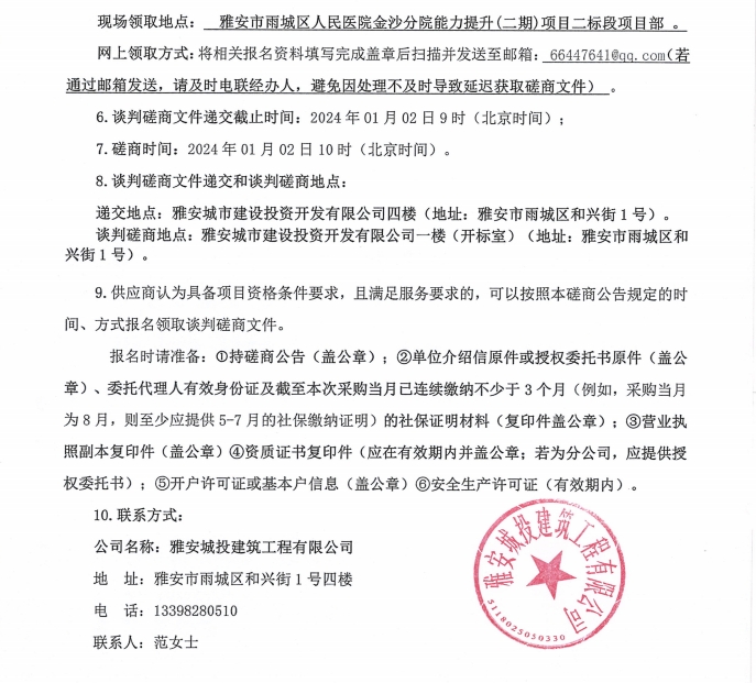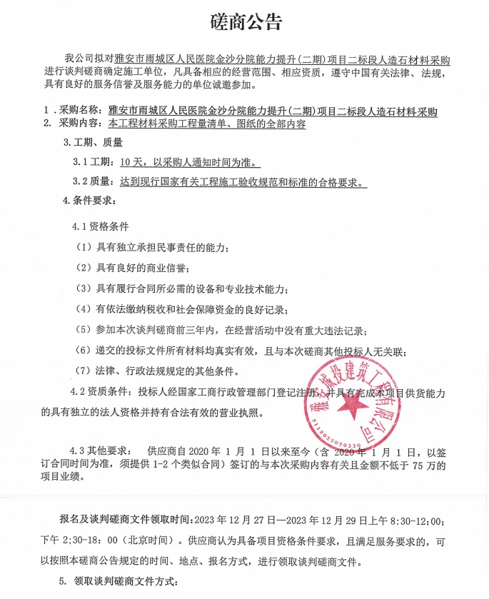 雅安市雨城區(qū)人民醫(yī)院金沙分院能力提升(二期)項目二標段人造石材料采購談判磋商公告