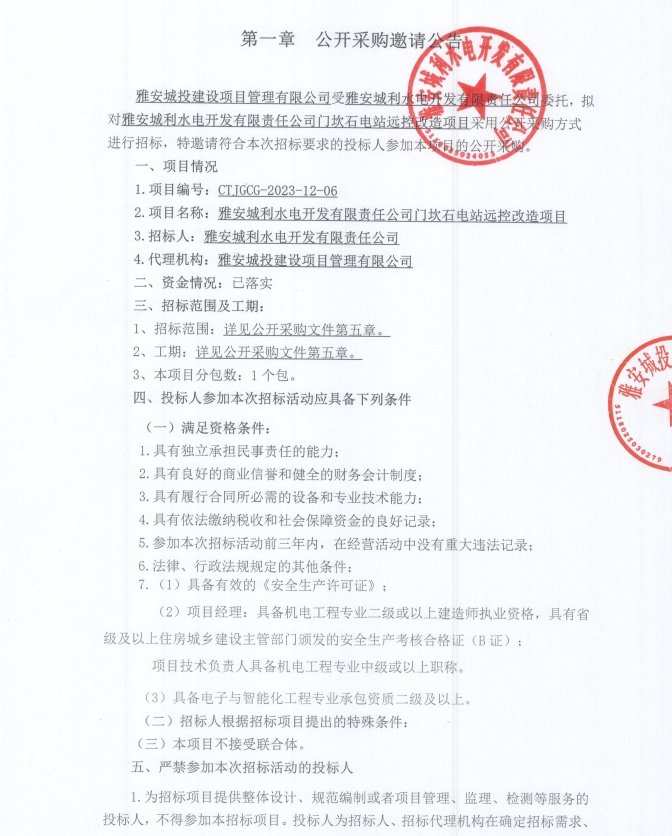 雅安城利水電開發(fā)有限責(zé)任公司門坎石電站遠控改造項目公開采購邀請公告