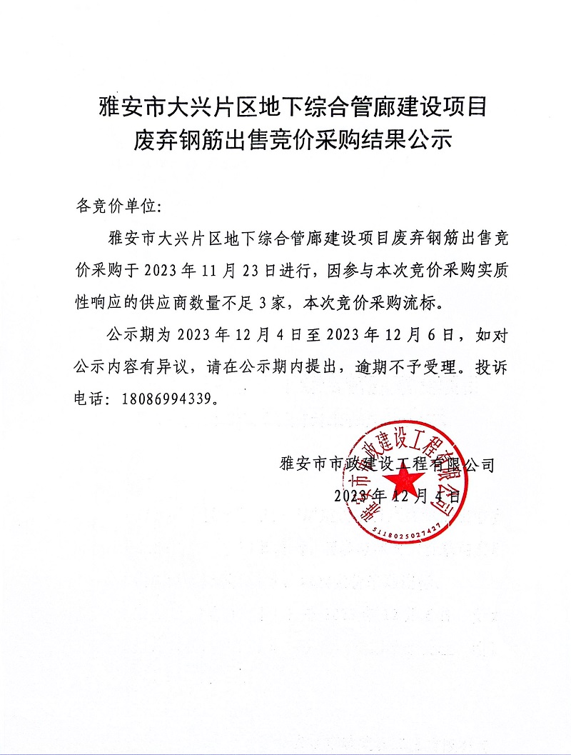 雅安市大興片區(qū)地下綜合管廊建設項目廢棄鋼筋出售競價采購結(jié)果公示