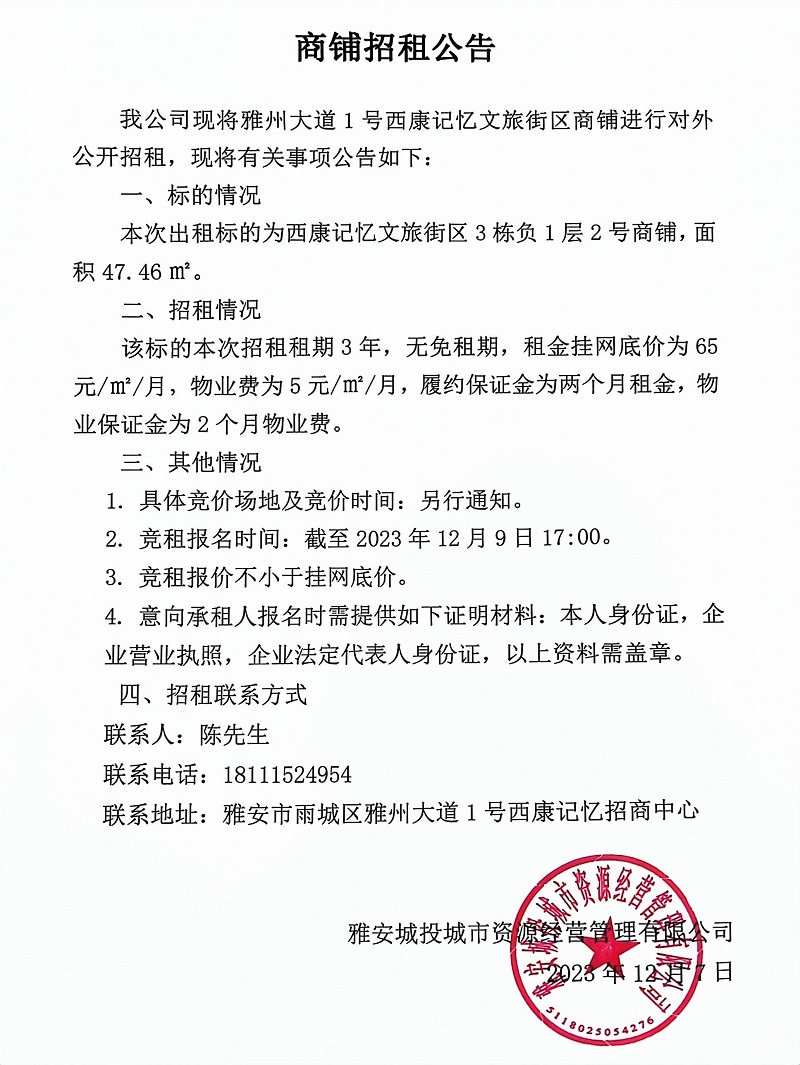 雅州大道1號西康記憶文旅街區(qū)3棟負1層2號商鋪招租公告