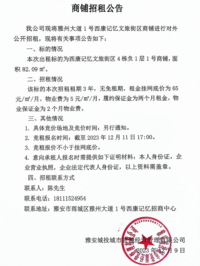 雅州大道1號西康記憶文旅街區(qū)4棟負1層1號商鋪招租公告