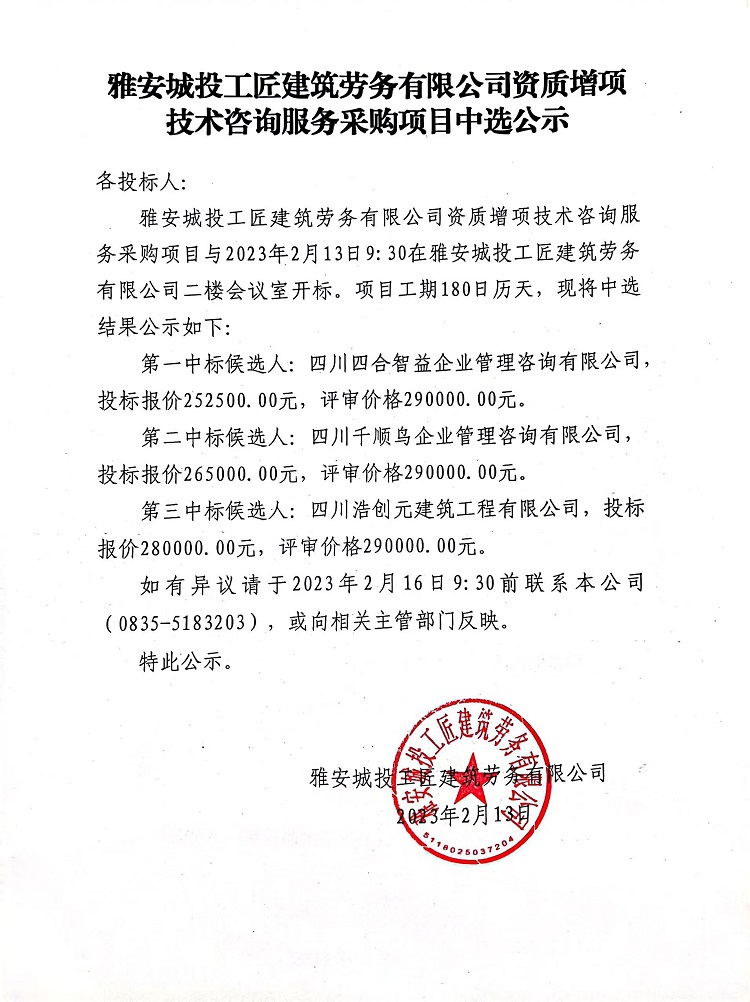 雅安城投工匠建筑勞務有限公司資質增項技術咨詢服務采購項目中選公示