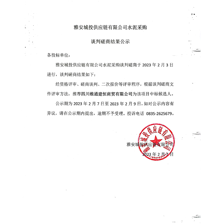 雅安城投供應鏈有限公司水泥采購談判磋商結果公示