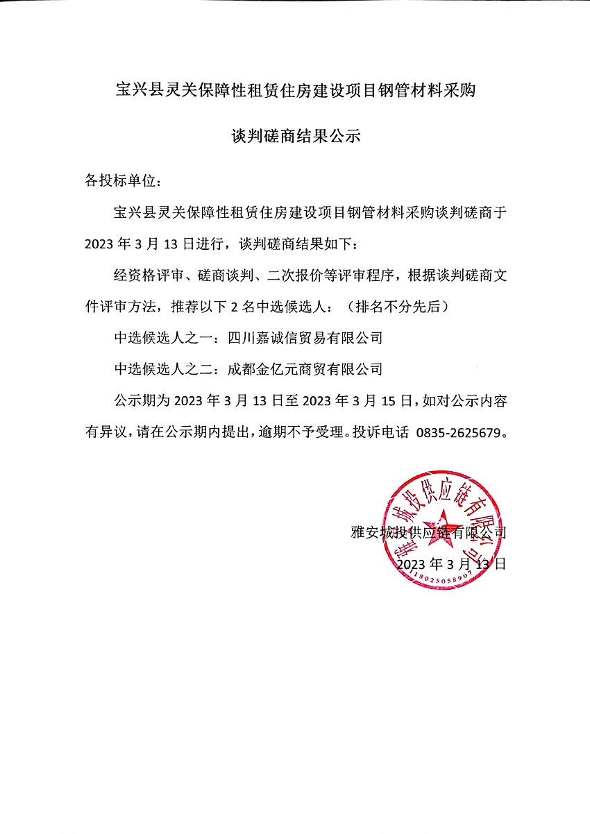 寶興縣靈關(guān)保障性租賃住房建設(shè)項(xiàng)目鋼管材料采購(gòu)談判磋商結(jié)果公示