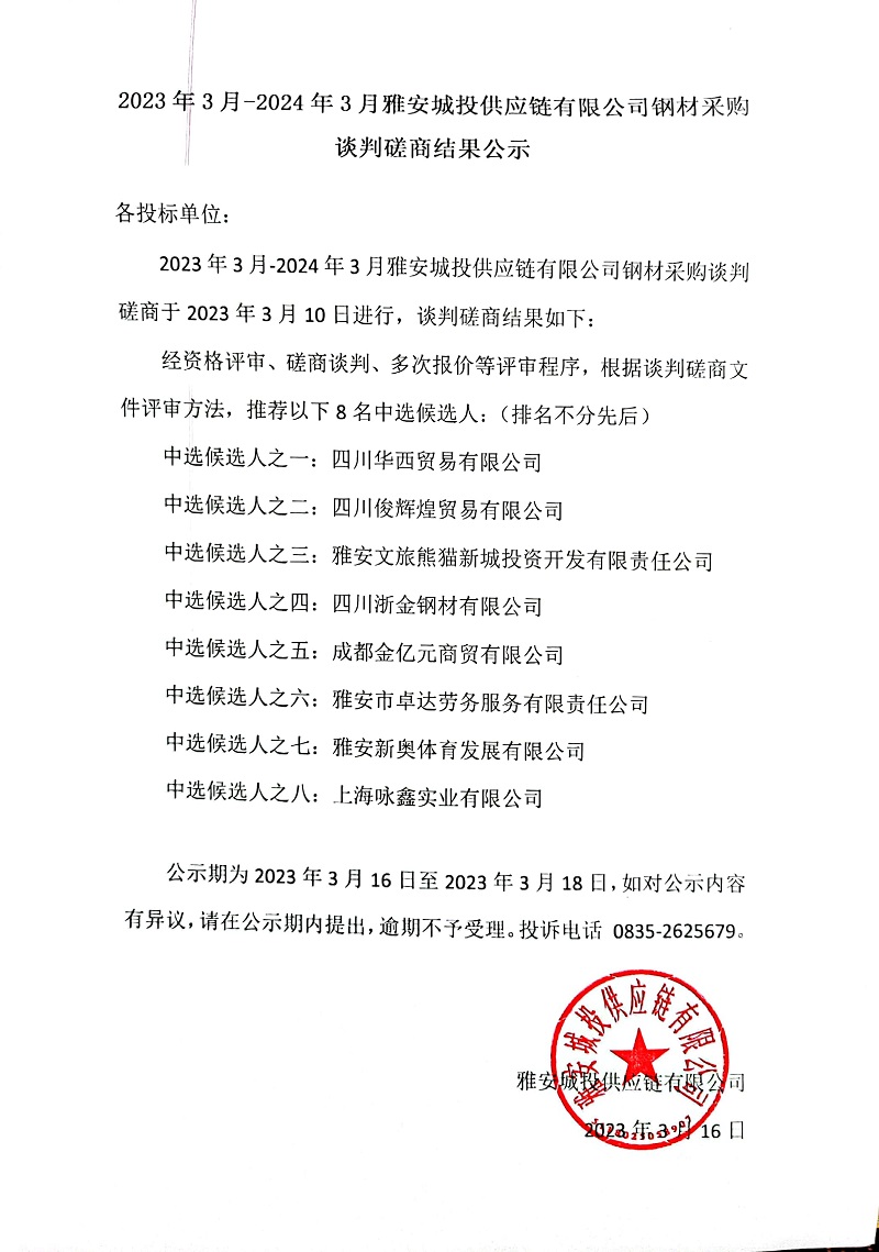 2023年3月-2024年3月雅安城投供應鏈有限公司鋼材采購談判磋商結果公示
