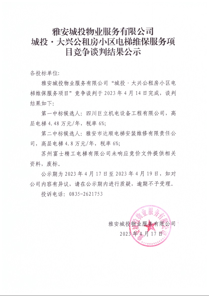 雅安城投物業(yè)有限公司城投·大興公租房小區(qū)電梯維保服務項目競爭談判結果公示