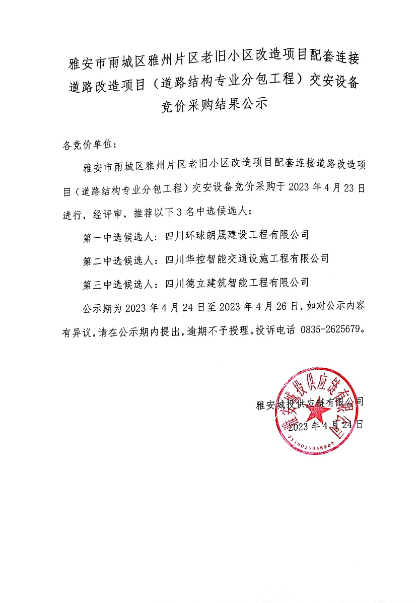 雅安市雨城區(qū)雅州片區(qū)老舊小區(qū)改造項(xiàng)目配套連接道路改造項(xiàng)目(道路結(jié)構(gòu)專業(yè)分包工程)交安設(shè)備競(jìng)價(jià)采購(gòu)結(jié)果公示