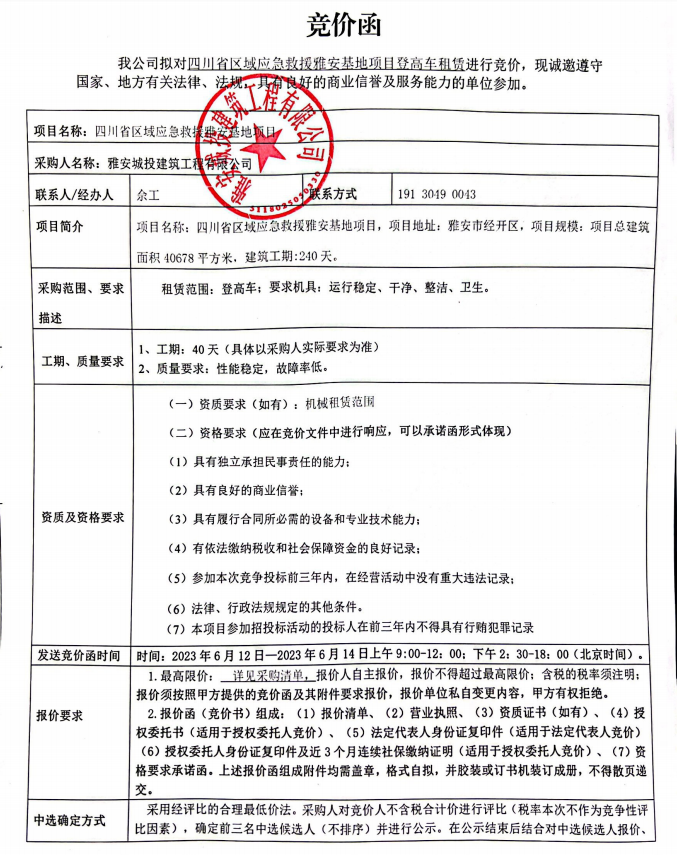 四川省區(qū)域應(yīng)急救援雅安基地項(xiàng)目登高車(chē)租賃競(jìng)價(jià)公告
