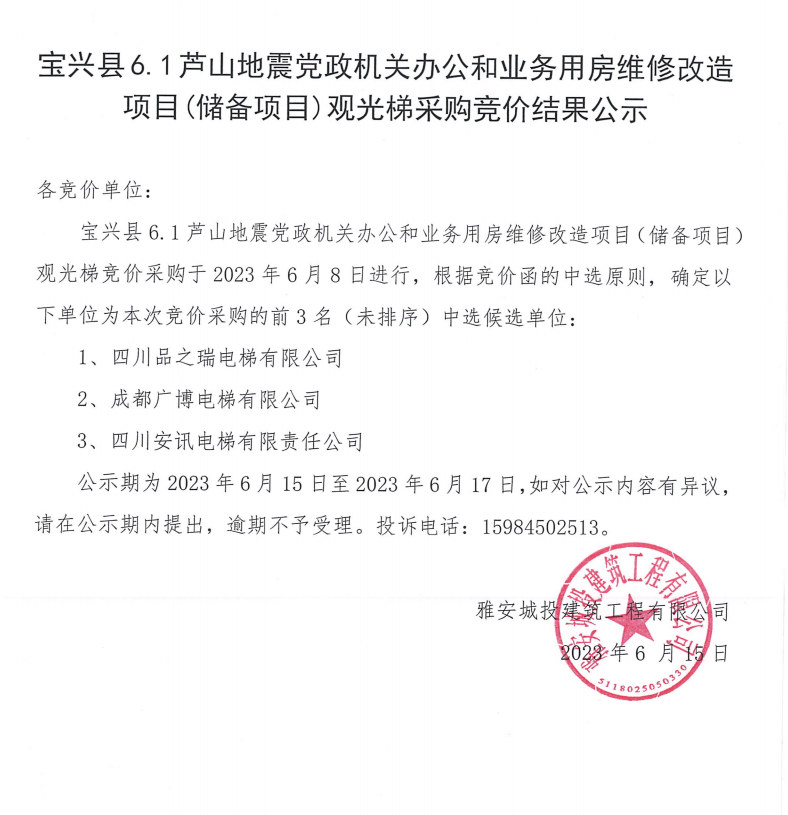 寶興縣6.1蘆山地震黨政機(jī)關(guān)辦公和業(yè)務(wù)用房維修改造項(xiàng)目(儲(chǔ)備項(xiàng)目)觀光梯采購(gòu)競(jìng)價(jià)結(jié)果公示