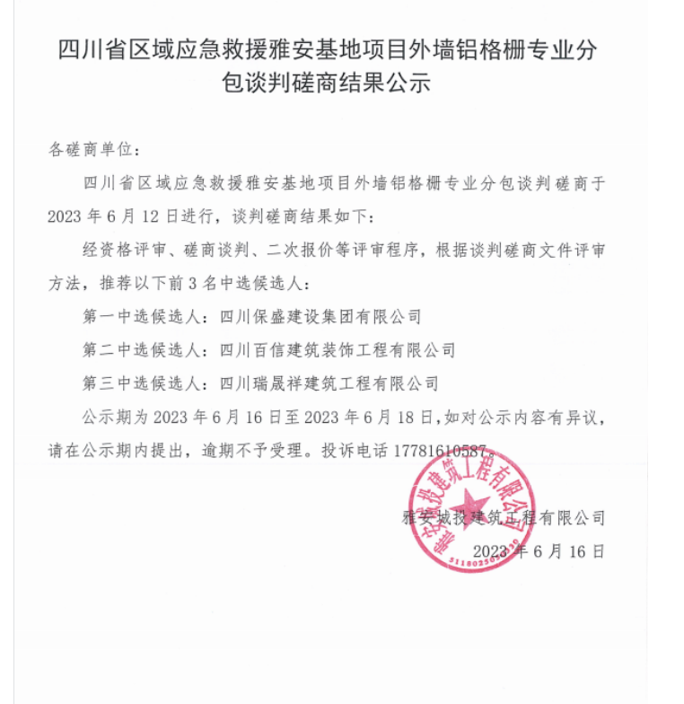 四川省區(qū)域應(yīng)急救援雅安基地項目外墻鋁格柵專業(yè)分包談判磋商結(jié)果公示
