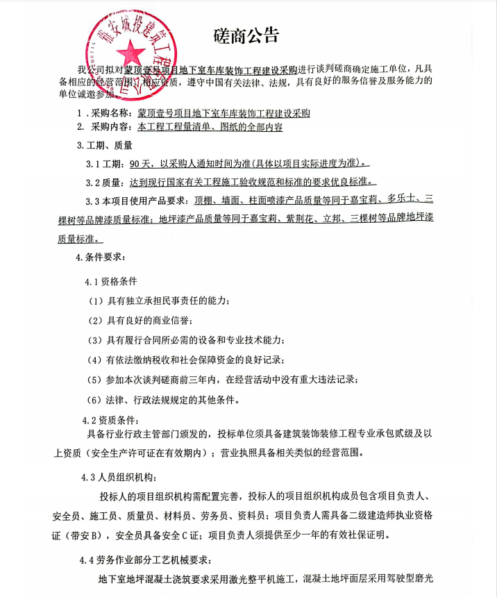 蒙頂壹號項(xiàng)目地下室車庫裝飾工程建設(shè)采購談判磋商公告