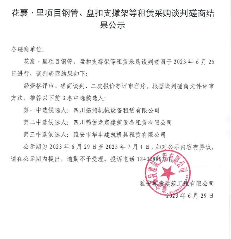 花襄·里項目鋼管、盤扣支撐架等租賃采購談判磋商結(jié)果公示