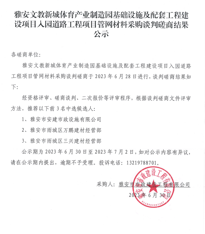雅安文教新城體育產(chǎn)業(yè)制造園基礎(chǔ)設(shè)施及配套工程建設(shè)項目入園道路工程項目管網(wǎng)材料采購談判磋商結(jié)果公示