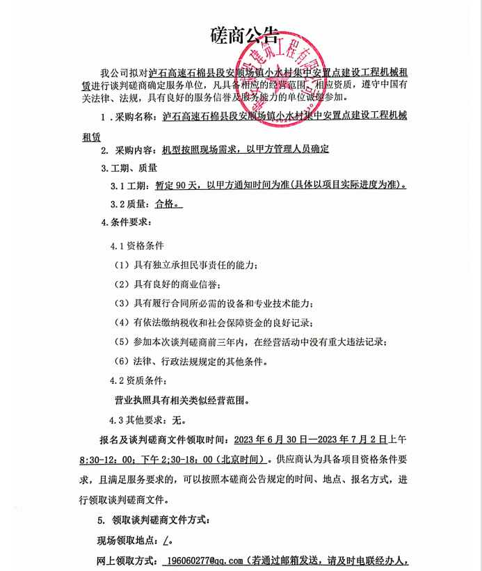 瀘石高速石棉縣段安順場鎮(zhèn)小水村集中安置點建設工程機械租賃談判磋商公告