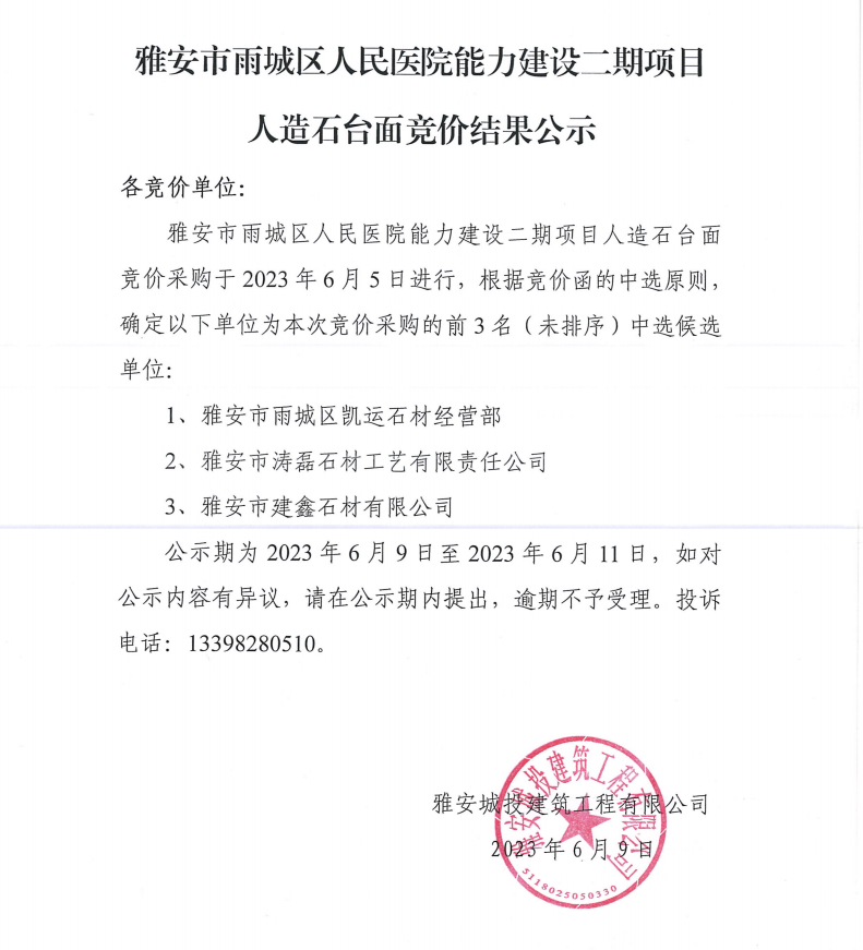 雅安市雨城區(qū)人民醫(yī)院能力建設(shè)二期項(xiàng)目人造石臺面競價(jià)結(jié)果公示