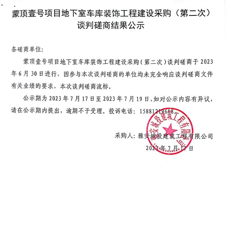 蒙頂壹號項目地下室車庫裝飾工程建設(shè)采購(第二次)談判磋商結(jié)果公示