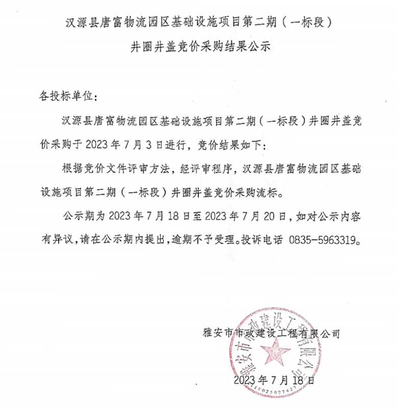 漢源縣唐富物流園區(qū)基礎(chǔ)設(shè)施項(xiàng)目第二期(一標(biāo)段)井圈井蓋競價(jià)采購結(jié)果公示