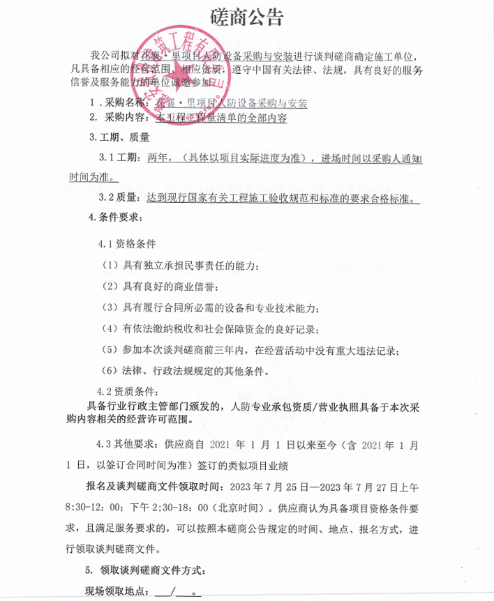 漢源縣花襄·里項目人防設備采購與安裝談判磋商公告