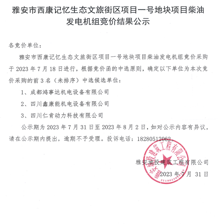 雅安市西康記憶生態(tài)文旅街區(qū)項目一號地塊項目柴油發(fā)電機(jī)組競價結(jié)果公示