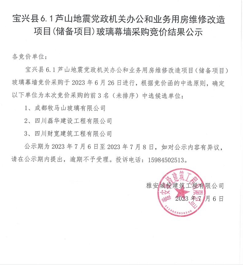 寶興縣6.1蘆山地震黨政機(jī)關(guān)辦公和業(yè)務(wù)用房維修改造項(xiàng)目(儲(chǔ)備項(xiàng)目)玻璃幕墻采購(gòu)競(jìng)價(jià)結(jié)果公示