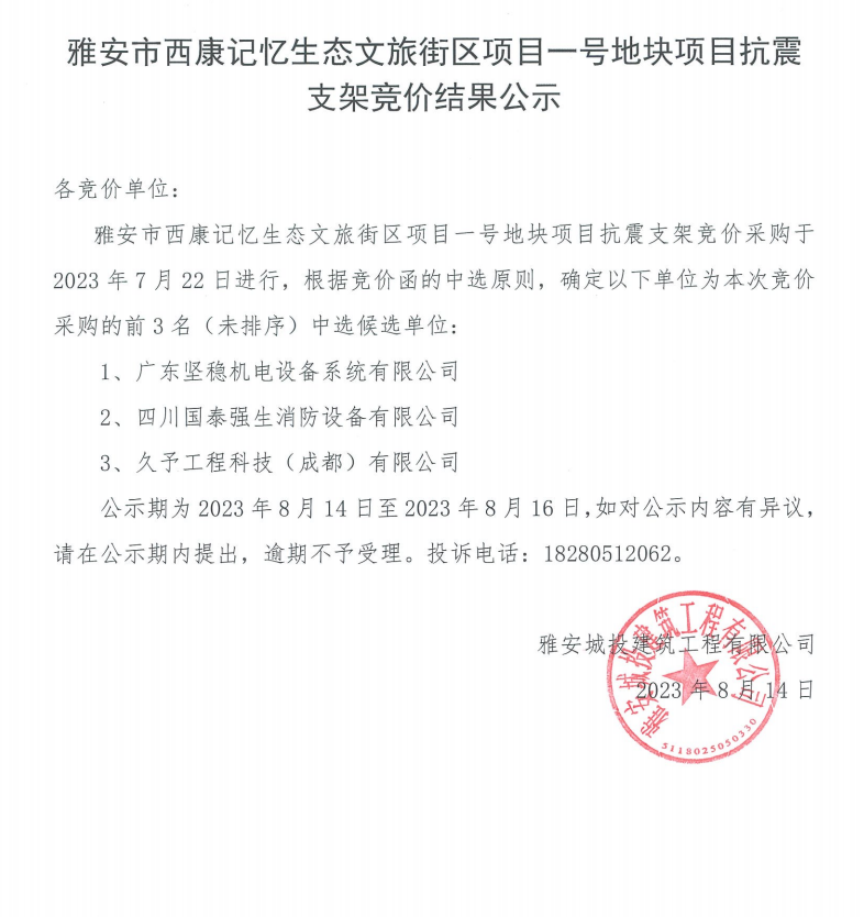 雅安市西康記憶生態(tài)文旅街區(qū)項目一號地塊項目抗震支架競價結果公示