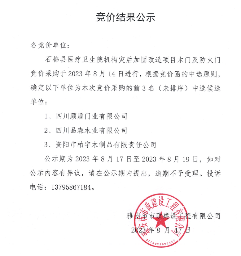 石棉縣醫(yī)療衛(wèi)生院機構(gòu)災(zāi)后加固改造項目木門及防火門競價采購結(jié)果公示