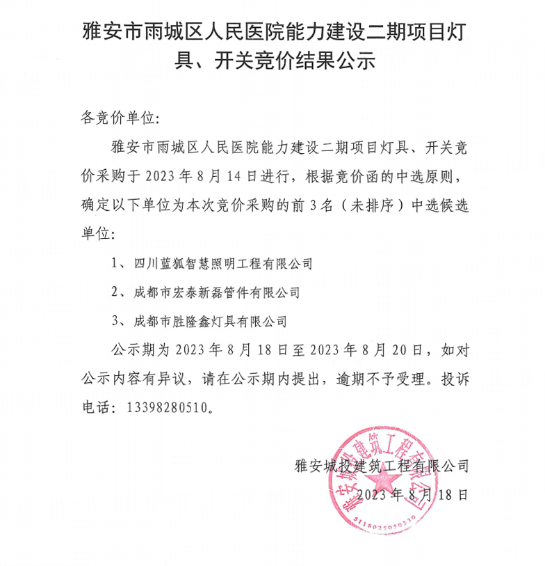 雅安市雨城區(qū)人民醫(yī)院能力建設(shè)二期項(xiàng)目燈具、開關(guān)競價(jià)結(jié)果公示