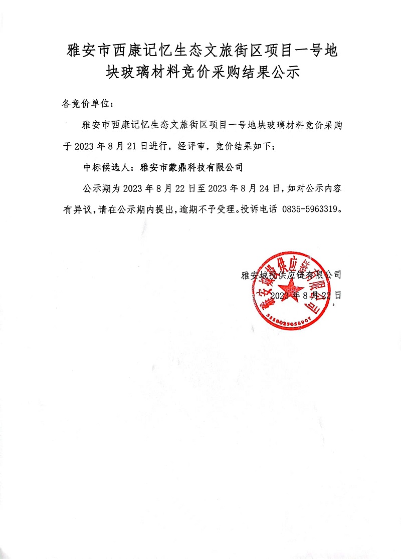 雅安市西康記憶生態(tài)文旅街區(qū)項(xiàng)目一號(hào)地塊玻璃材料競(jìng)價(jià)采購(gòu)結(jié)果公示