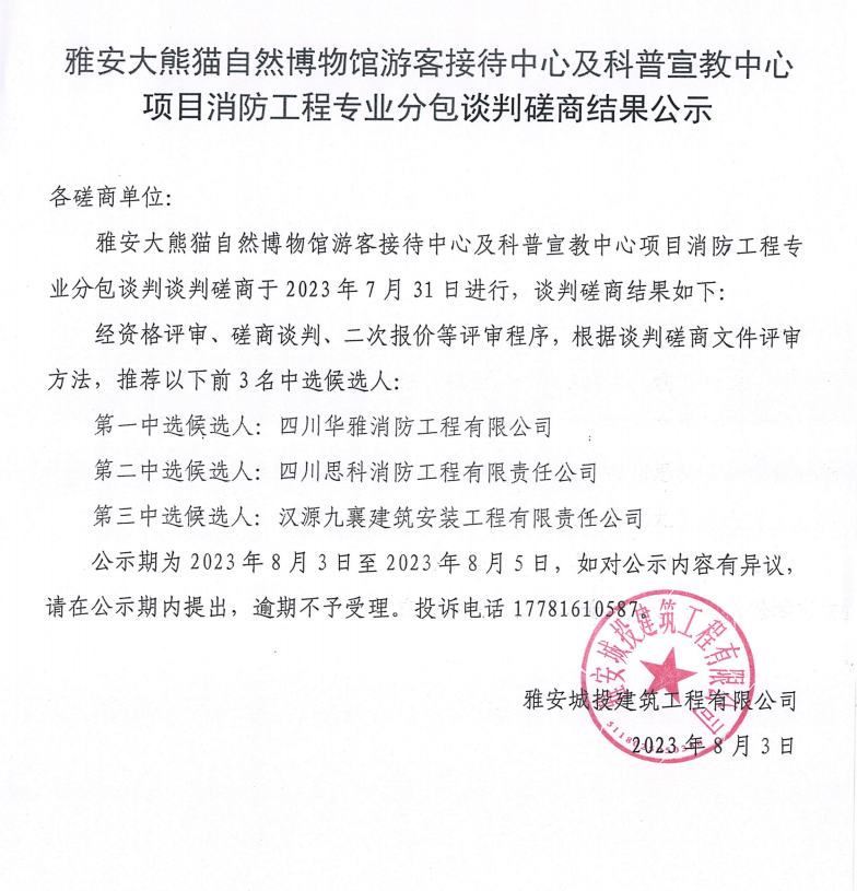 雅安大熊貓自然博物館游客接待中心及科普宣教中心項目消防工程專業(yè)分包談判磋商結(jié)果公示